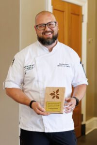 This year’s Service & Social Action award was presented to Chef Jonathan Burns, a member of Wake Forest’s Hospitality and Auxiliary Services team and Director of Culinary Development for Harvest Table Culinary Group. Chef Burns was recognized for his leadership in sustainable food sourcing, prioritizing third-party certified products and supporting small-scale farms that promote soil, ecosystem, and community health. He has spearheaded an innovative partnership with regional food hub 4P Foods and implemented a weekly sustainable sourcing audit—now a model across Harvest Table accounts. Thanks to his efforts, Wake Forest recently achieved a record 37% of food spend from certified sustainable sources, exceeding its 30% goal.
