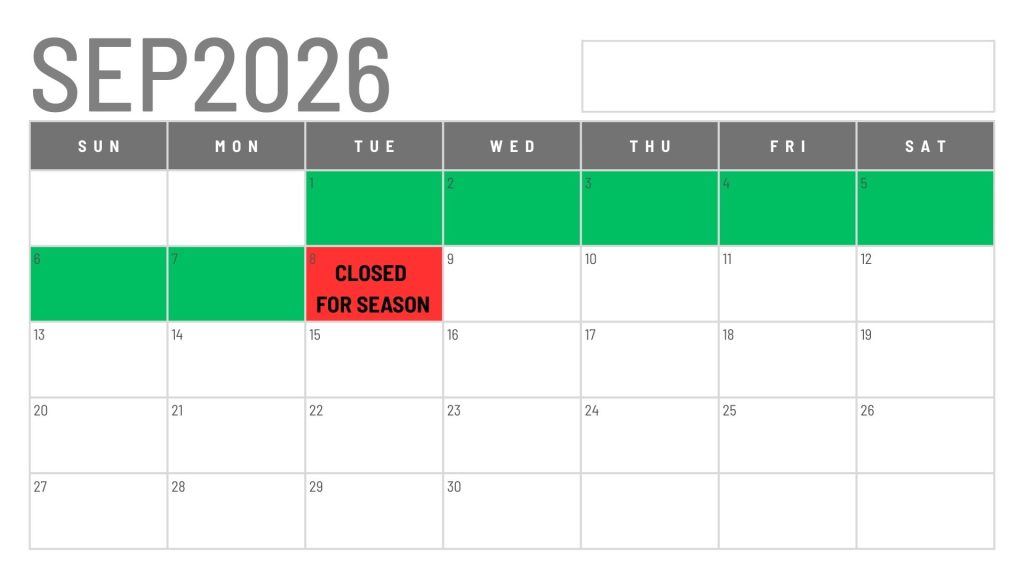 Closed for season: Monday, September 7, 2026 @ 8:00 p.m.