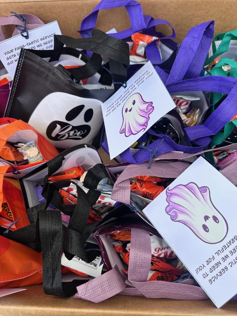 These teams work tirelessly to keep our campus running smoothly. Whether it’s getting students where they need to go, managing parking operations, or ensuring mail and packages are delivered efficiently. To recognize their dedication, Hospitality & Auxiliary Services came together to share a little Halloween cheer with sweet treats and words of thanks.