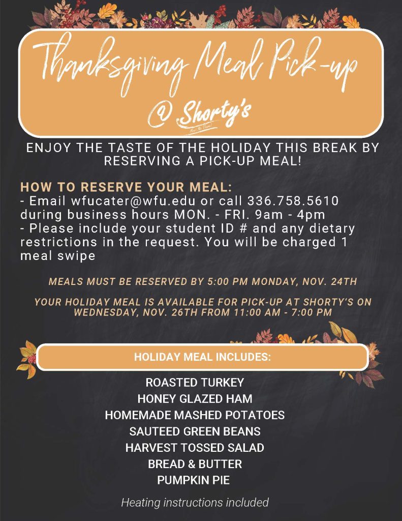 Deacon Dining is offering a Thanksgiving meal pick-up on Wednesday, November 26, 2025, for students who will be on campus over the holiday weekend. Pick up your meal between 11:00 a.m. and 7:00 p.m. To reserve your meal, email wfucater@wfu.edu or call 336.758.5610. You will need to include your student ID number, any dietary restrictions in your request. Your account will also be charged 1 meal swipe.
